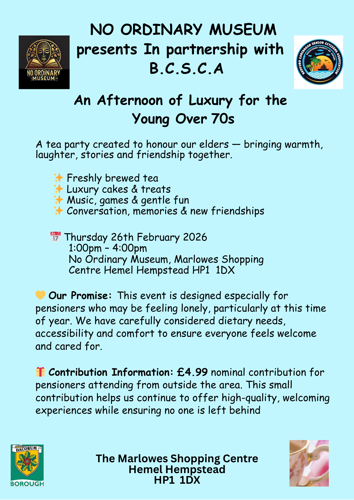 No Ordinary Museum warmly invites our Golden Generation to a beautiful afternoon of tea, luxury cakes, festive cheer and meaningful connection. This special Christmas gathering honours your stories, your contribution, and the important place you hold in our community.